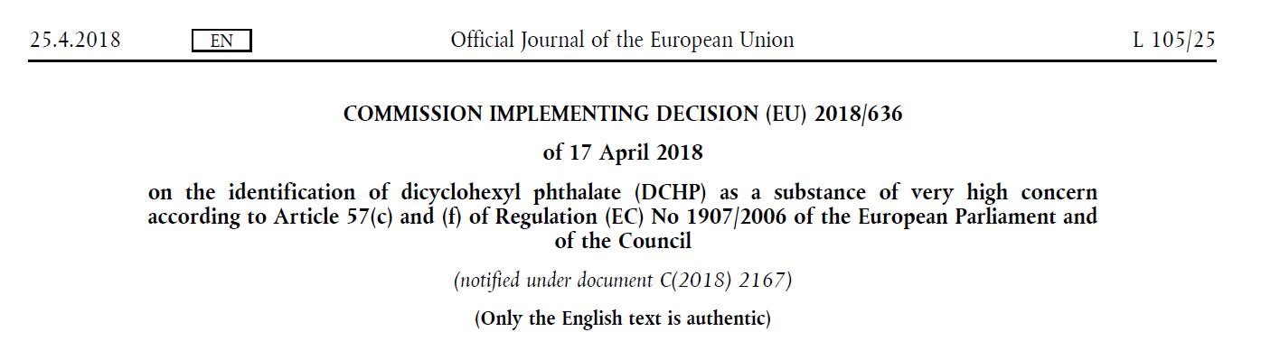 2018年4月25日,欧盟官方公报发布指令(EC)No 2018/636,鉴定邻苯二甲酸二环己酯(DCHP)为高度关注物质,ECHA计划在今年6月份或7月份将DCHP加入SVHC清单,正式实施日期应以ECHA正式加入的时间为准。