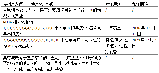 2024年12月左右,将PFOA相关化合物指定为第一类特定化学物质并实施禁令,并禁止进口含PFOA异构体或其盐及PFOA相关化合物的产品。