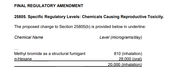 【加州65】美国加利福尼亚公布正己烷的最大允许剂量水平