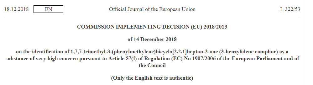 2018年12月18日,欧盟官方公报发布指令(EU)2018/2013,根据REACH法规第57(f)条将1,7,7-三甲基-3-(苯基亚甲基)双环[2.2.1]庚-2-酮(3-亚苄基樟脑)确定为高度关注物质(SVHC)。3-亚苄基樟脑具有内分泌干扰属性,可能对环境造成严重影响,预计近期将被更新入SVHC候选物质清单。
