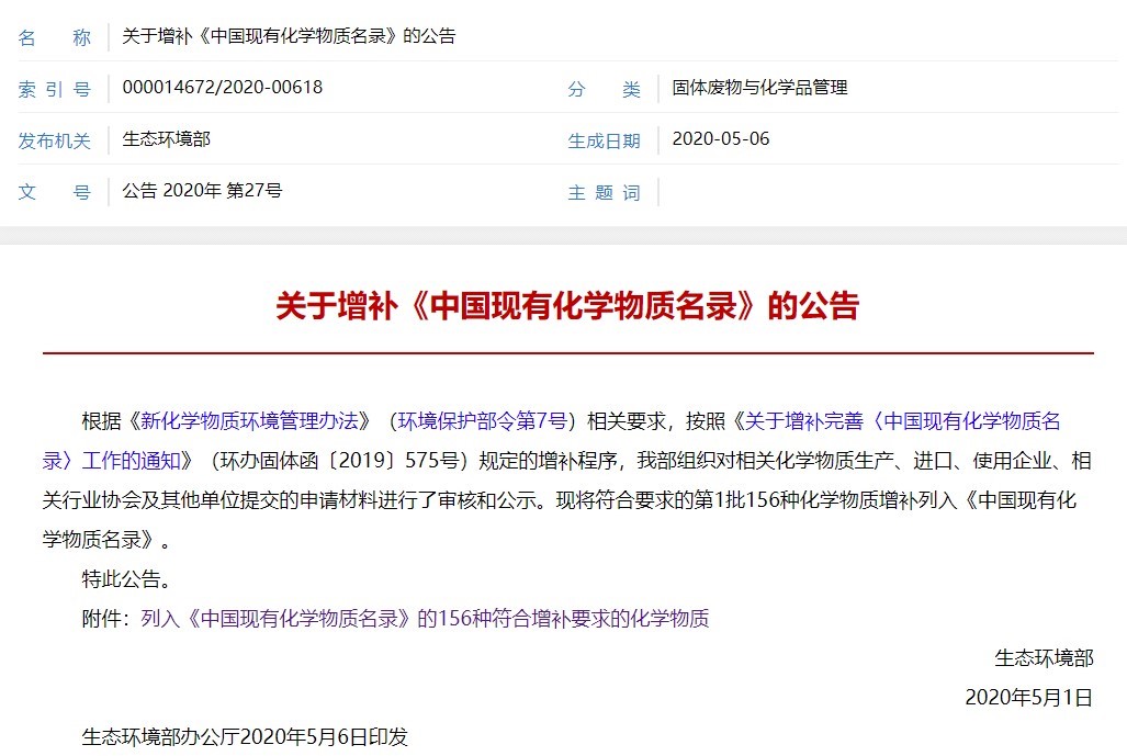 2020年 5月 6日, 生态环境部官方网站发布《关于增补 <中国现有化学物质名录 >的公告》( 2020年第 27号)(以下称《公告》),把符合《关于增补完善〈中国现有化学物质名录〉工作的通知》(环办固体函〔 2019〕 575号)的相关规定和要求,第 1批共 156种化学物质增补列入《中国现有化学物质名录》( IECSC),并按现有化学物质管理。