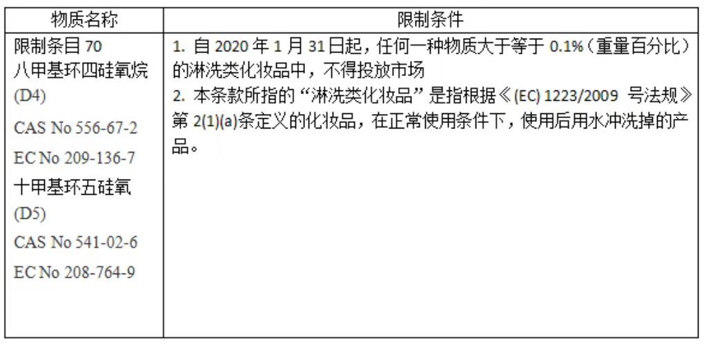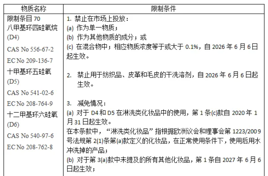 2024 年 5 月 16 日, 欧洲委员会发布了一项新的限制措施,旨在减少八甲基环四硅氧烷(D4)、十甲基环五硅氧烷 (D5)和十二甲基环六硅氧烷(D6)对环境的影响。根据2006年通过的《化学品注册、评估、授权与限制法规》(REACH法规),此次新规对这三种化学物质在非淋洗类化妆品及其他消费者和专业产品中的使用进行了严格限制。