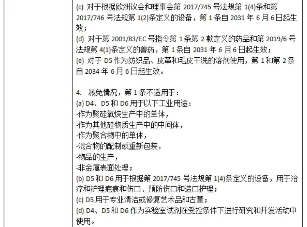 6. 作为减损,第1款(c)项不适用于在下列条件下将含有D4、D5或D6作为有机硅聚合物残留物的混合物投放市场: 7. 作为减损,第1款和第2款不适用于在严格控制的纺织品、皮革和毛皮密闭干洗系统中投放市场使用或使用D5作为溶剂,其中清洁溶剂被回收或焚烧。 |
